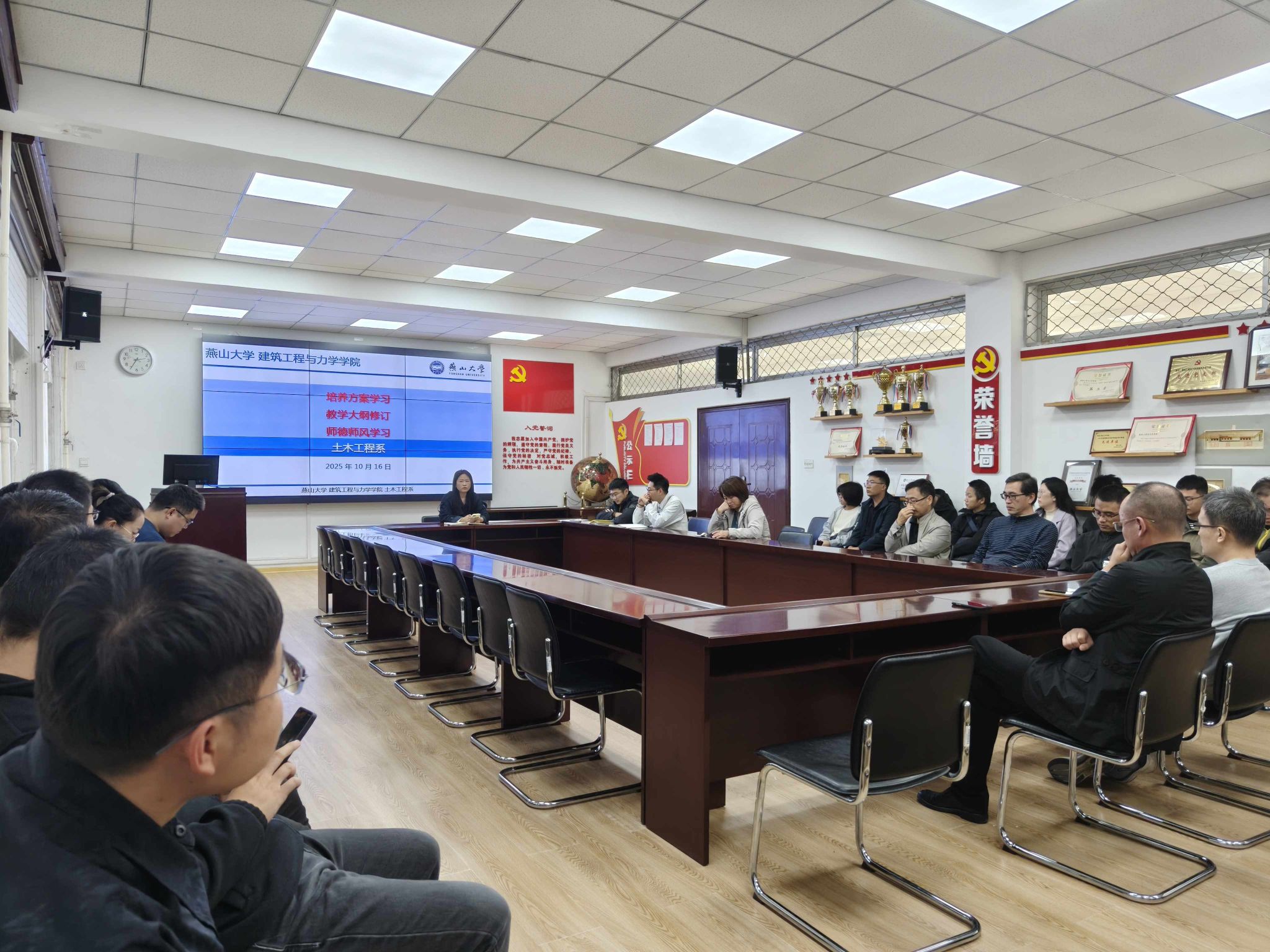 2025年10月16日,为主动适配人工智能技术赋能土木工程行业的发展浪潮,落实新版本科人才培养方案对课程改革的要求,建筑工程与力学学院土木工程系在系会议室召开全系教师会议。会议由系主任李雨浓教授主持,副主任杨烨凯、吴吉贤、陈正心及全体教师参加。会议针对人工智能背景下的教学大纲修订展开深入研讨。
