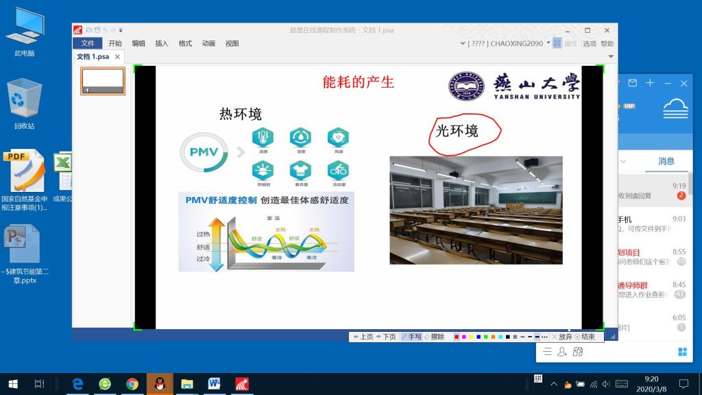 自2月12日起,张老师便开始准备本学期的《建筑节能》线上课程,在超星学习通导师QQ群中了解了线上视频课程的制作方法,并准备了超星在线课程制作系统。考虑在线平台使用量过大,网络不畅的问题,确定采用录播的方式开展本学期的线上教学。