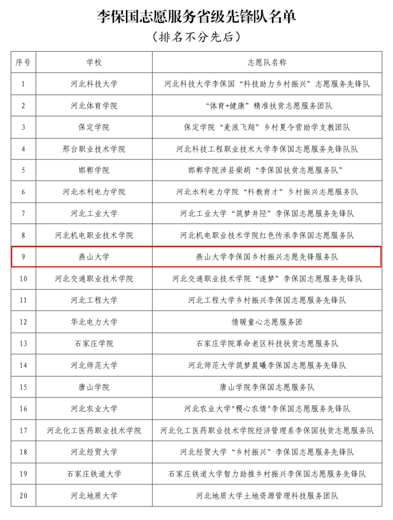 近日,河北省教育厅公布了《李保国志愿服务省级先锋队名单》,由校团委牵头、建筑工程与力学学院和经济管理学院联合申报的“燕山大学李保国乡村振兴志愿服务先锋队”脱颖而出,成功入选并获得省级专项经费支持。这是我院连续第二年获评立项,将激励更多师生求真务实、学以致用,踊跃投身祖国建设和乡村振兴。