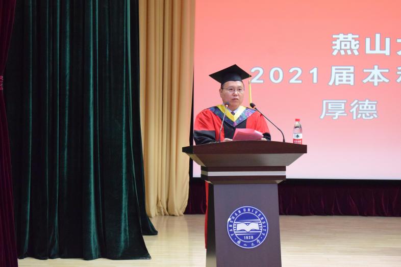 学院永远是毕业生坚强的后盾。院长赵庆新代表学院向各位毕业生表示热烈的祝贺,向为学生的成长倾注心血、默默耕耘的老师们致以最诚挚的感谢。赵庆新院长对毕业生提出六点希望:一是树立明确的奋斗目标。要带走燕大人为理想而奋斗的精神。二是脚踏实地干实事。把眼前每一份小的工作当成一份事业来完成。三是勇于创新。通过学习、思索和领悟提高学习效率。四是锻炼身体强健体魄。多为自己的身体充电。五是助人为乐。急人之困,助人终助己。六是多一点情怀。踏踏实实做好每一个工程就是建工人的大情怀。赵庆新院长表示,建工学院永远是每一位毕业生心灵的港湾,衷心祝愿大家平安健康、前程似锦。