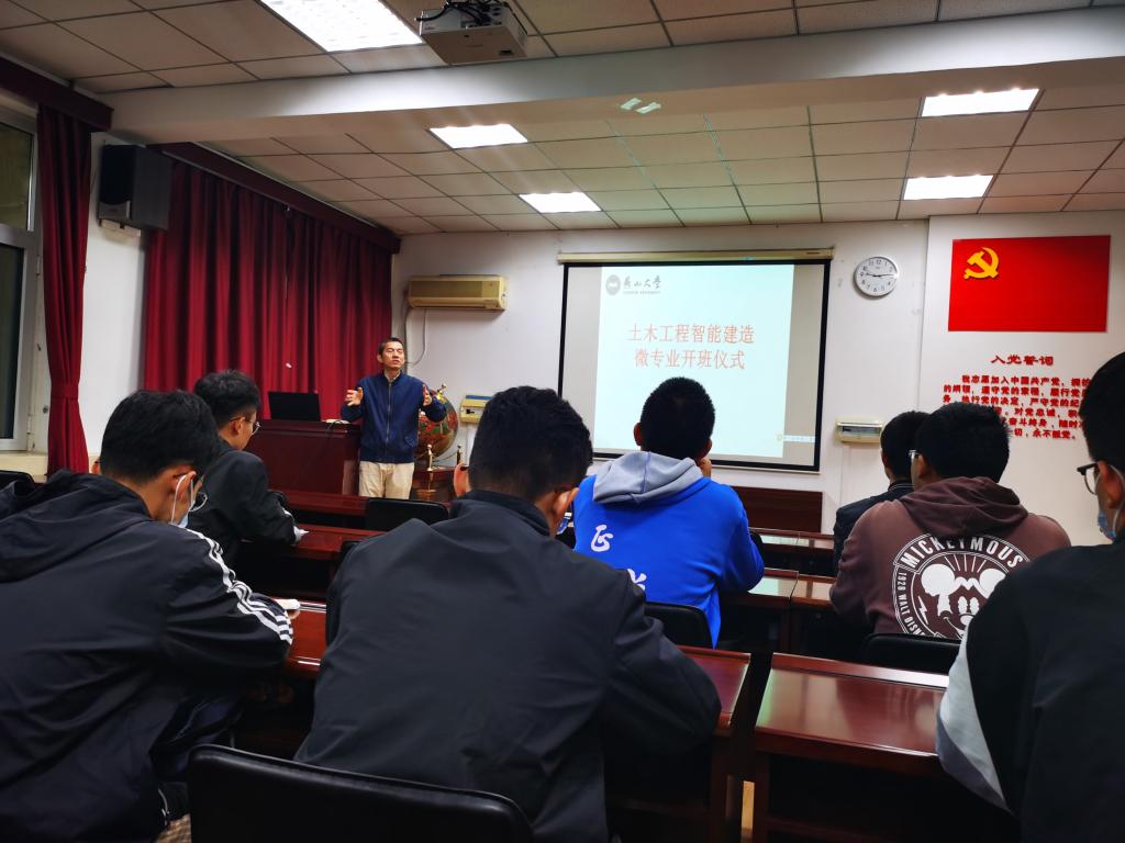 2021年10月10日我院土木工程智能建造微专业开班仪式在建筑馆211会议室举行,首届微专业共招生学生20名,分别来自建筑工程、道路与桥梁工程、岩土与地下工程、工程力学、建筑环境与能源应用工程、机械制造及其自动化、冶金机械、机电控制工程等8个专业方向,基本形成了学科交叉融合的专业特点。微专业培养计划共设置16学分、8门核心课程,涉及机器人技术、BIM建模技术、3D打印技术、创新方法驱动、工程伦理等多个领域,将于2021年10月底正式授课。