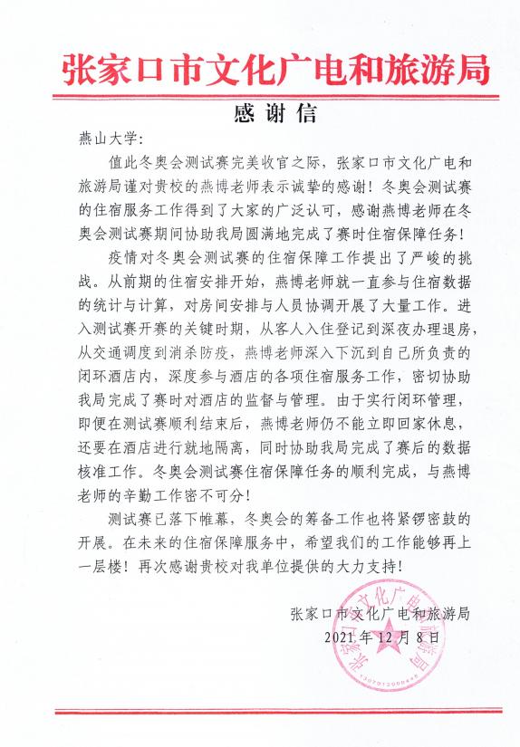 近日,燕山大学收到一封来自张家口市文化广电和旅游局的感谢信。信中对我校建筑工程与力学学院辅导员燕博老师在冬奥会系列测试赛期间协助张家口市文化广电和旅游局圆满完成赛时住宿保障任务表示感谢。