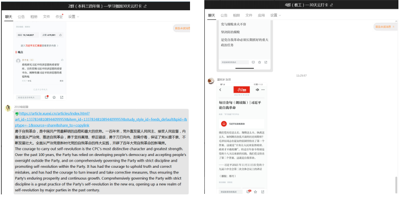 自活动开展以来,全院师生积极响应,共有668名学生和64名教工参与此次打卡学习活动。大家利用寒假时间,争做“学习强国达人”和“学习强国标兵”。通过分享学习成果,使参与者由“引导鼓励学”变为“积极主动学”,迅速掀起了学习热潮。学员们听原著,说要闻,读党史,写笔记,译金句,上传声情并茂的朗诵,分享别具一格的见解,形成了比学赶超的良好氛围。