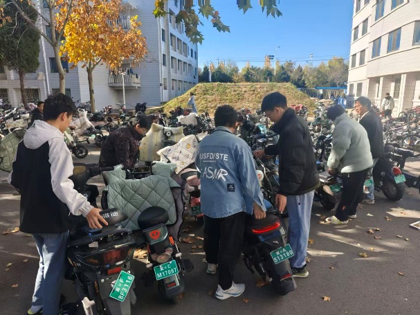 活动当日,同学们准时于指定地点集合,迅速投身停车区域整理工作。我校东区六舍、八舍门口停车区作为校园内人流量大的停放点,日常车辆往来频繁,常年存在车辆歪斜错位、占用通道及少量垃圾堆积问题。同学们迅速分工、默契配合。在六舍门口,志愿者们轻挪自行车,或是两人调整电动车,还耐心修正车头朝向,确保车辆规范入位;东八舍区域,大家注重细节,或调整间距、或修正压线、或清理杂物,让停车区环境“加分” 。经过努力,杂乱停车区焕然一新:车辆分区停放、排列成行,车头统一朝向。摆放整齐的车辆成为了一道校园温馨文明风景线。