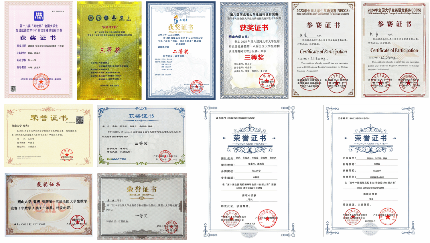 栗爽先后取得第十一届国际高校BIM毕业设计创新大赛国家级一等奖、第十届全国高校BIM毕业设计创新大赛国家级二等奖(担任队长)、十八届先进成图大赛智能建筑结构设计赛道国家级三等奖(担任队长)、2025年全国大学生测绘学科创新创业智能大赛测绘技能竞赛国家级二等奖、第十五届全国大学生数学竞赛燕山大学第一名,河北省一等奖、第十八届全国大学生结构设计大赛河北省分区赛省级三等奖(担任队长),累计获得5项国家级奖项、3项省市级奖项和10余项校级奖项。