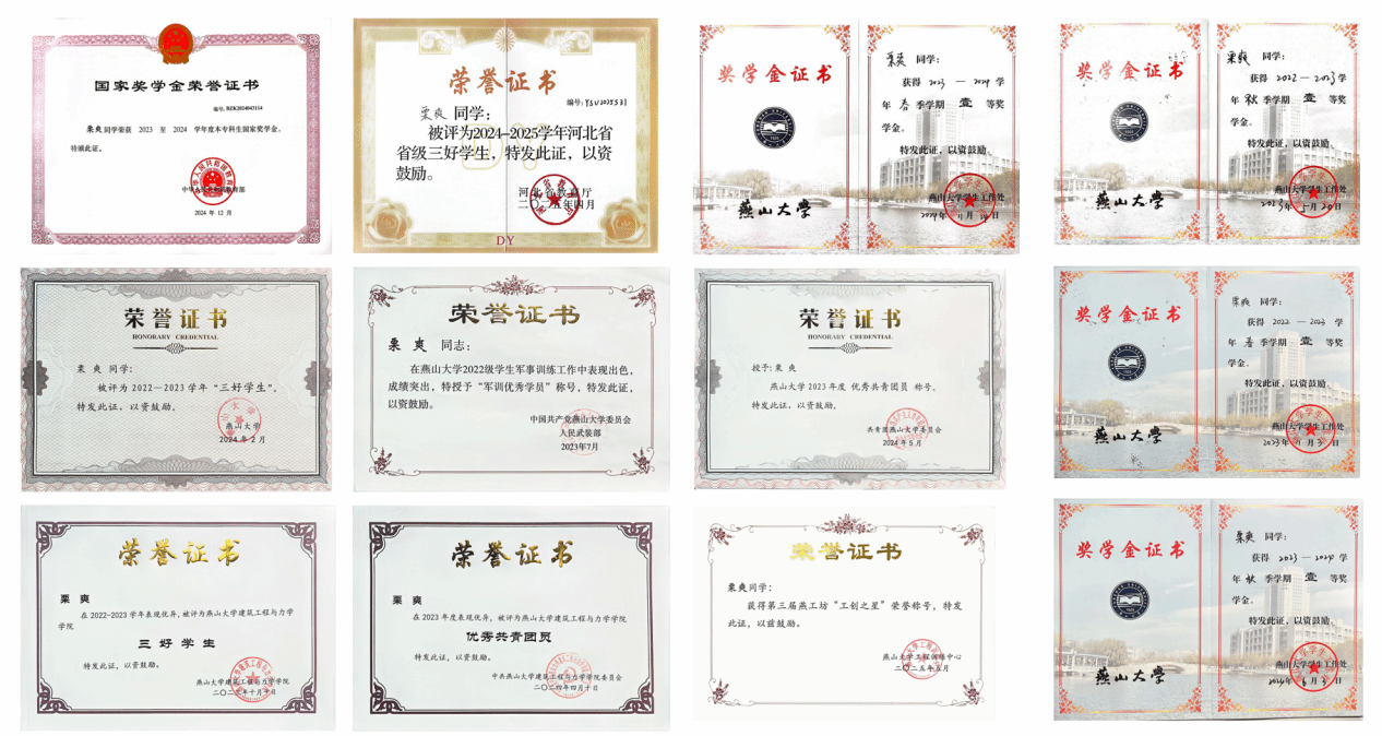 三年多来,栗爽始终对自己的学业生涯有明确、清晰的规划,力求做好每一门课程的课前预习、课后总结及考前复习。通过自己的不断努力,他在已修完的92门课程中,44门获得95分以上、75门课程获得90分以上、82门课程获得85分以上,三年课程加权平均分93.52分、学分绩点4.21。他连续三年绩点和综测位列专业第一名,连续六次获校级一等奖学金,先后荣获国家奖学金、河北省三好学生、燕山大学三好学生标兵、两次燕山大学三好学生和燕山大学优秀共青团员等19项荣誉,最终推荐至天津大学攻读土木水利专业学位硕士研究生。