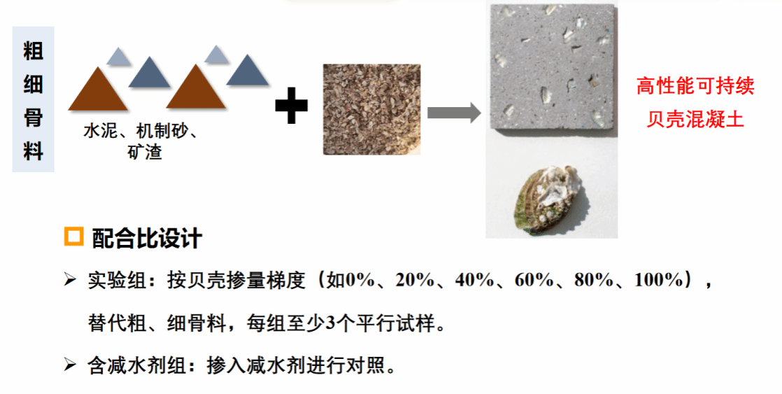 栗爽作为项目负责人,主持了省级大学生创新训练项目《废弃贝壳制备可持续混凝土》的研究,将废弃贝壳作为再生粗、细骨料制备可持续性混凝土,采用交叉试验系统研究不同废弃贝壳种类与掺量等关键参数对混凝土力学性能和流动性能的影响,从而确定最佳配合比,分析废弃贝壳混凝土的微观结构的发育规律,为废弃贝壳在混凝土工程中的进一步推广应用提供参考。