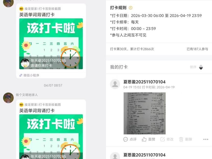 图1 工作人员按时发布打卡任务,同学们积极完成打卡